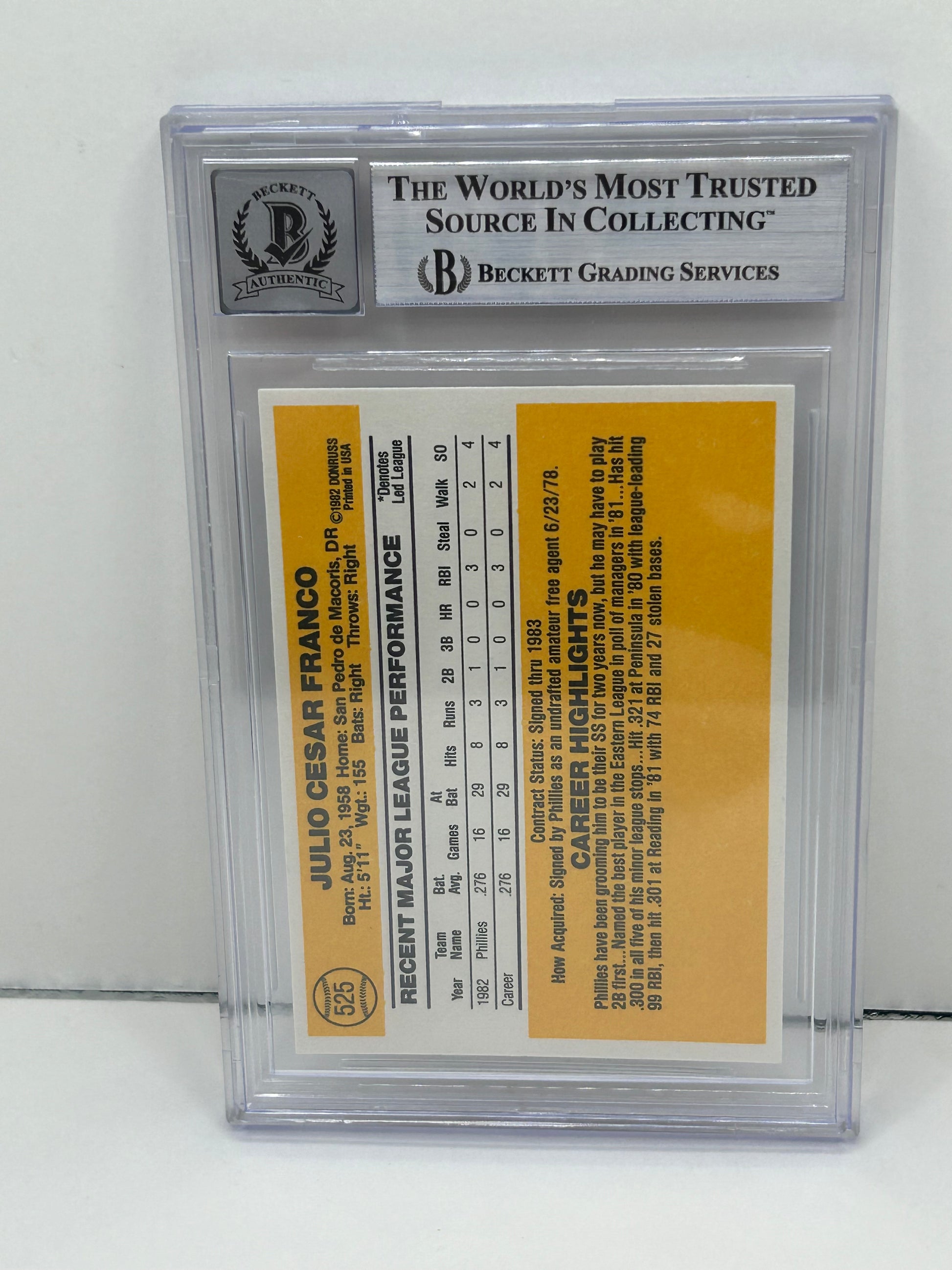 1983 Donruss Julio Franco #525 Auto Beckett Witnessed Beckett 10 Autograph (4696)