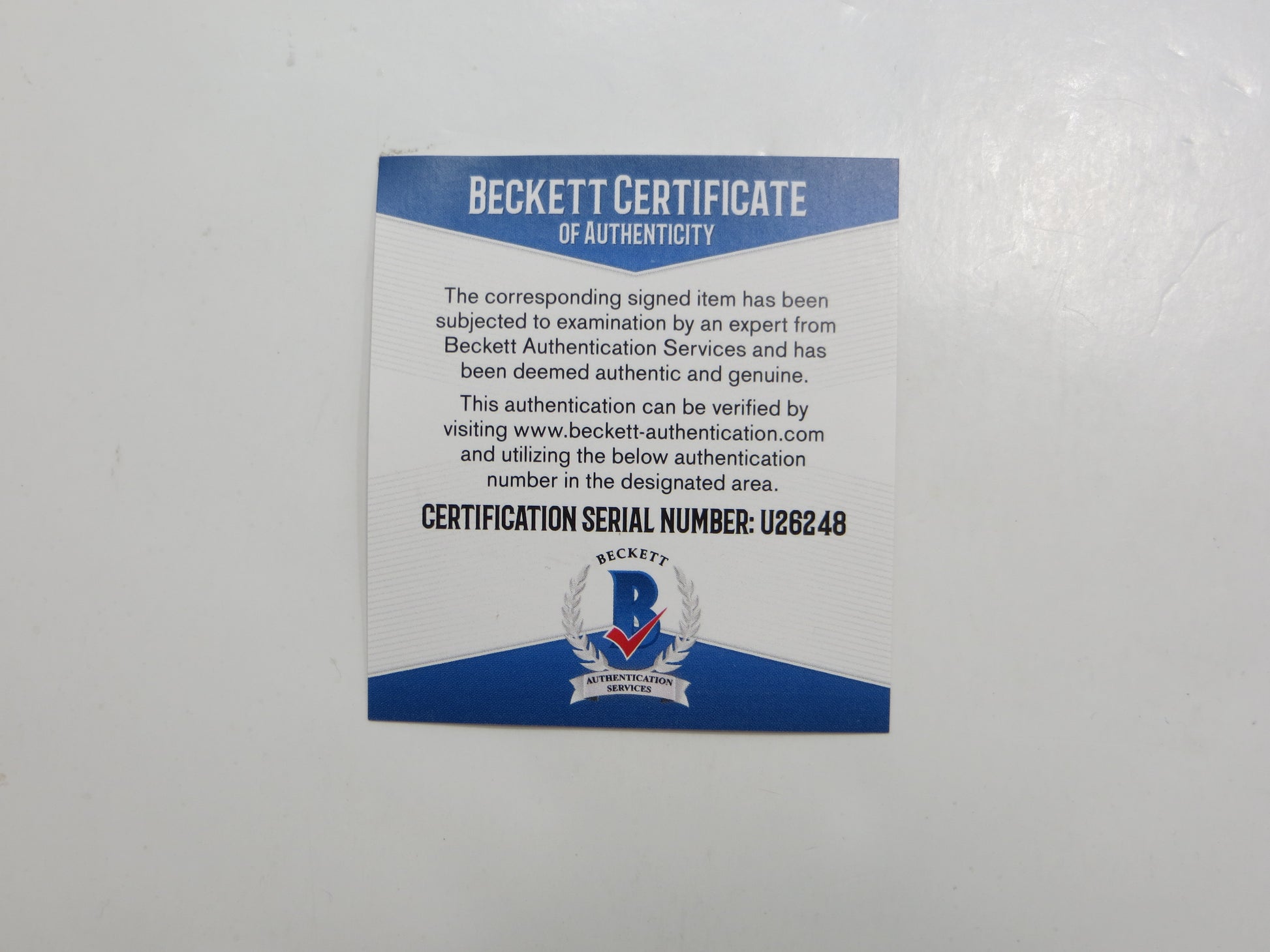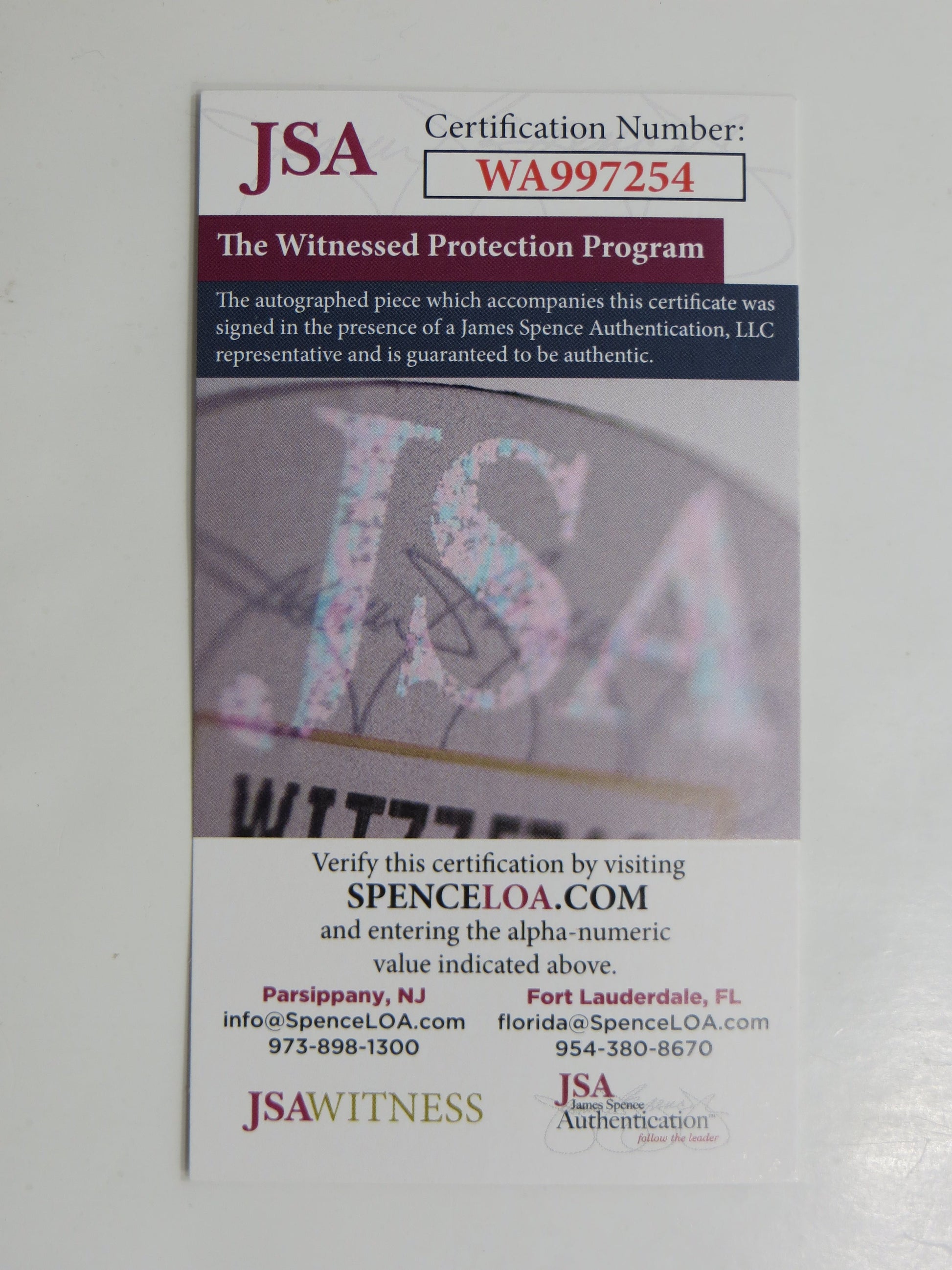 This item comes with a matching numbered sticker to a Certificate of Authenticity card from James Spence Authentication (JSA) and matching numbered sticker to a Certificate of Authenticity card from Beckett Authentication Services (BAS).