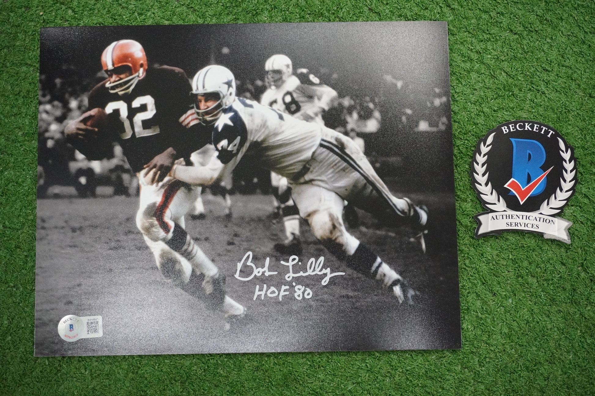 BOB LILLY DALLAS COWBOYS SIGNED 8x10 PHOTO vs JIM BROWN w/HOF 80 BAS COA
