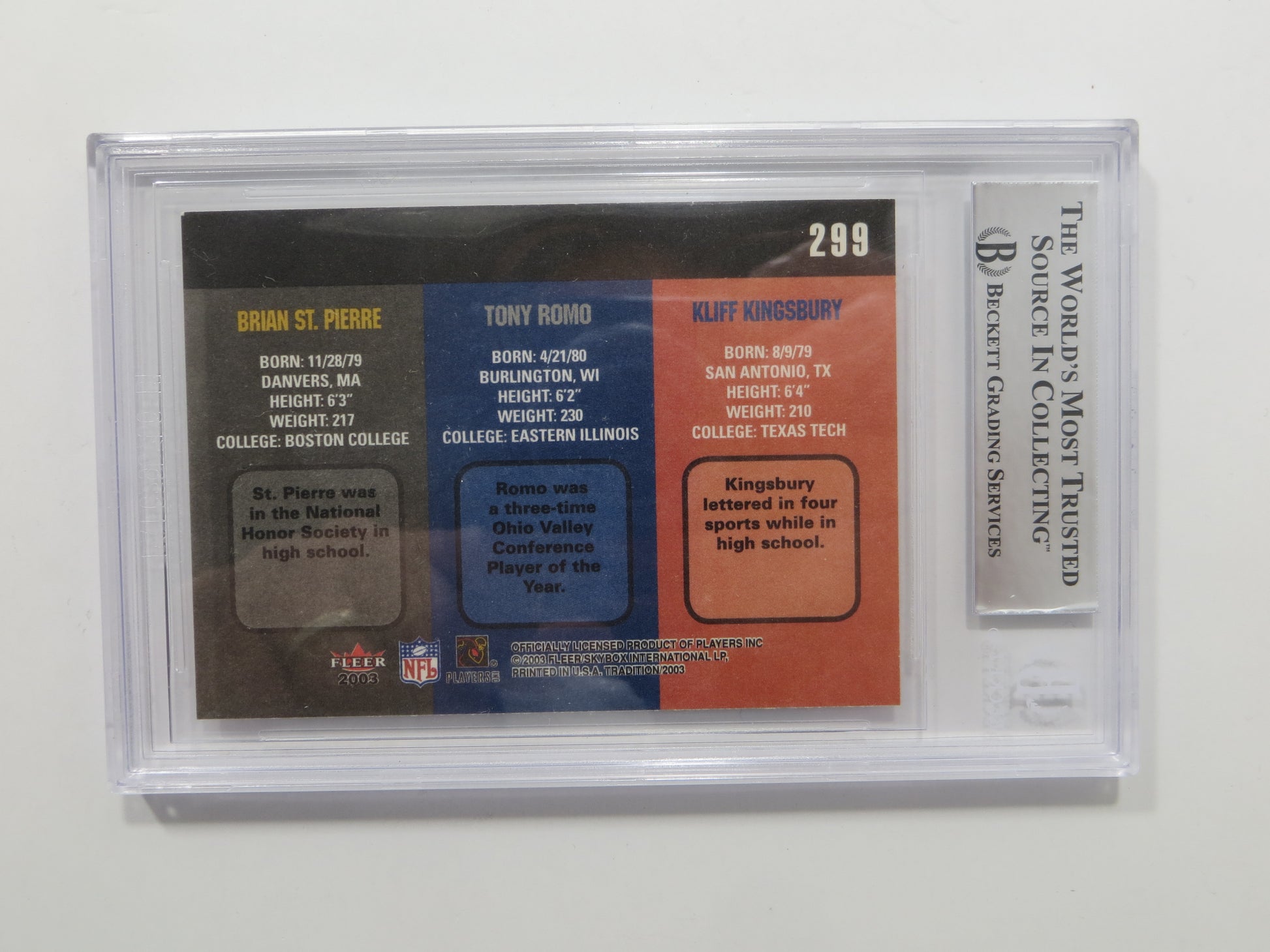 TONY ROMO SIGNED BGS BAS SLAB 2003 FLEER TRADITION #299 DALLAS COWBOYS