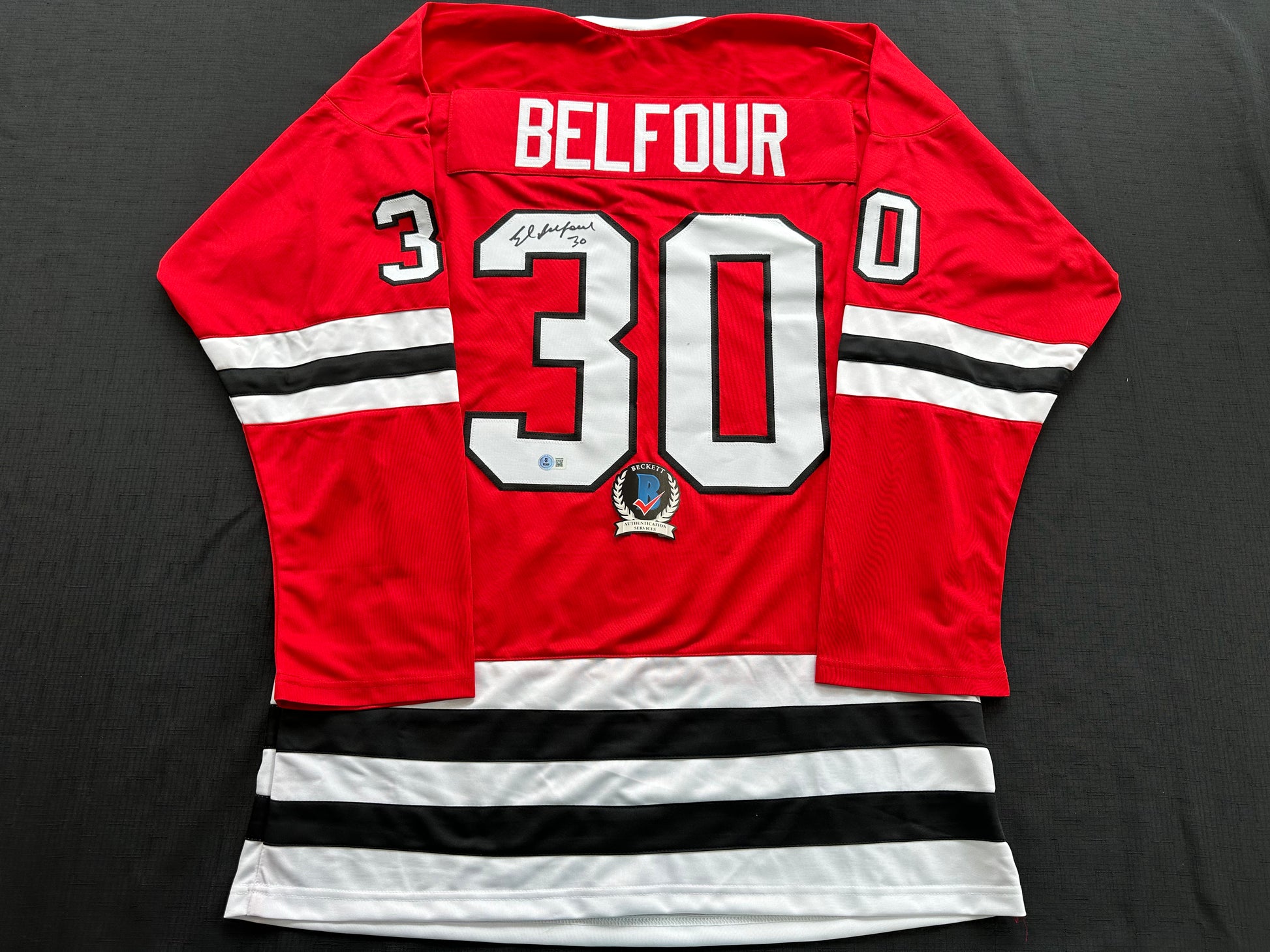 ED BELFOUR SIGNED RED Chicago Black Hawks Jersey BAS