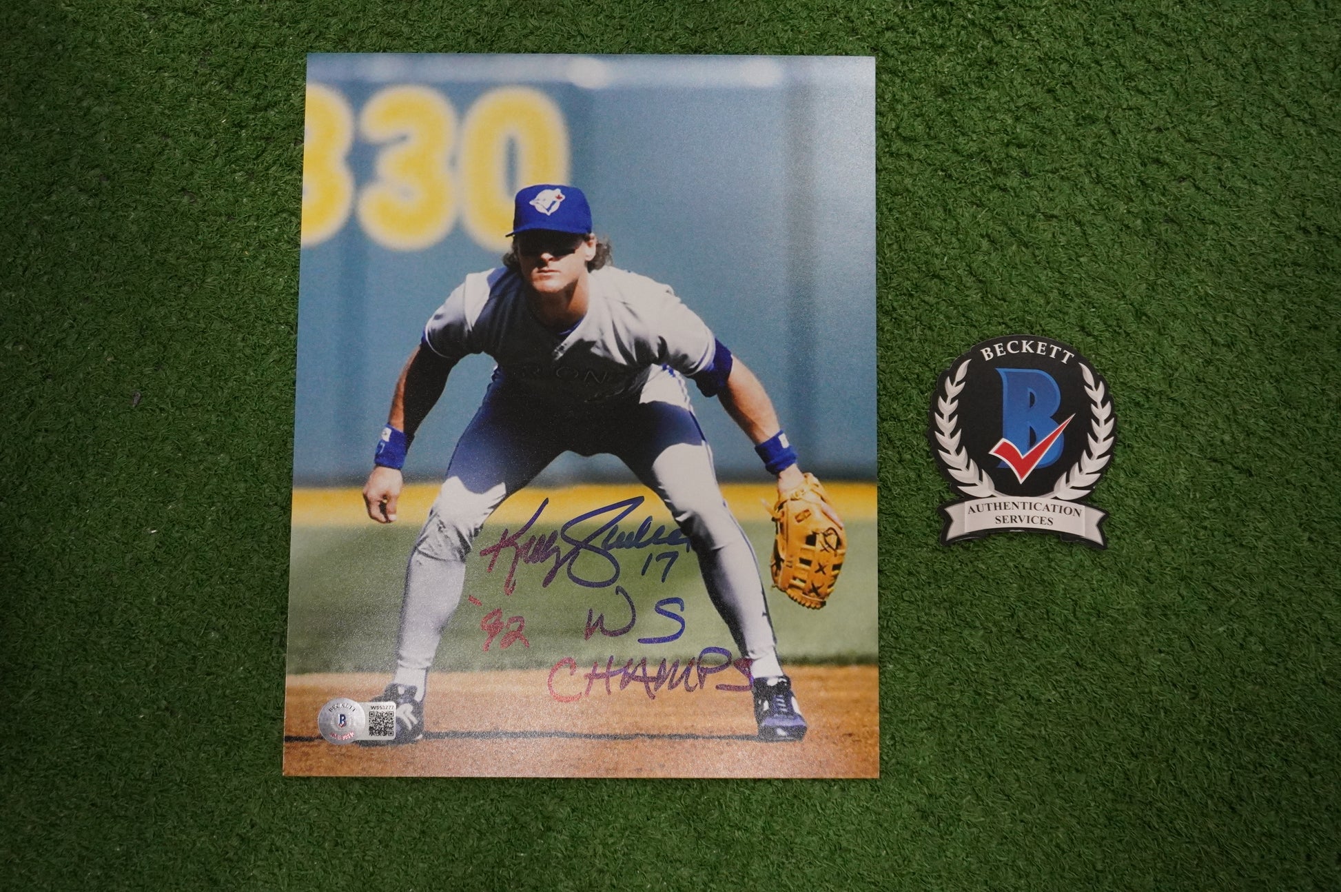 KELLY GRUBER Signed 8x10 Photo TORONTO BLUE JAYS w/"92 W.S Champs" BAS COA