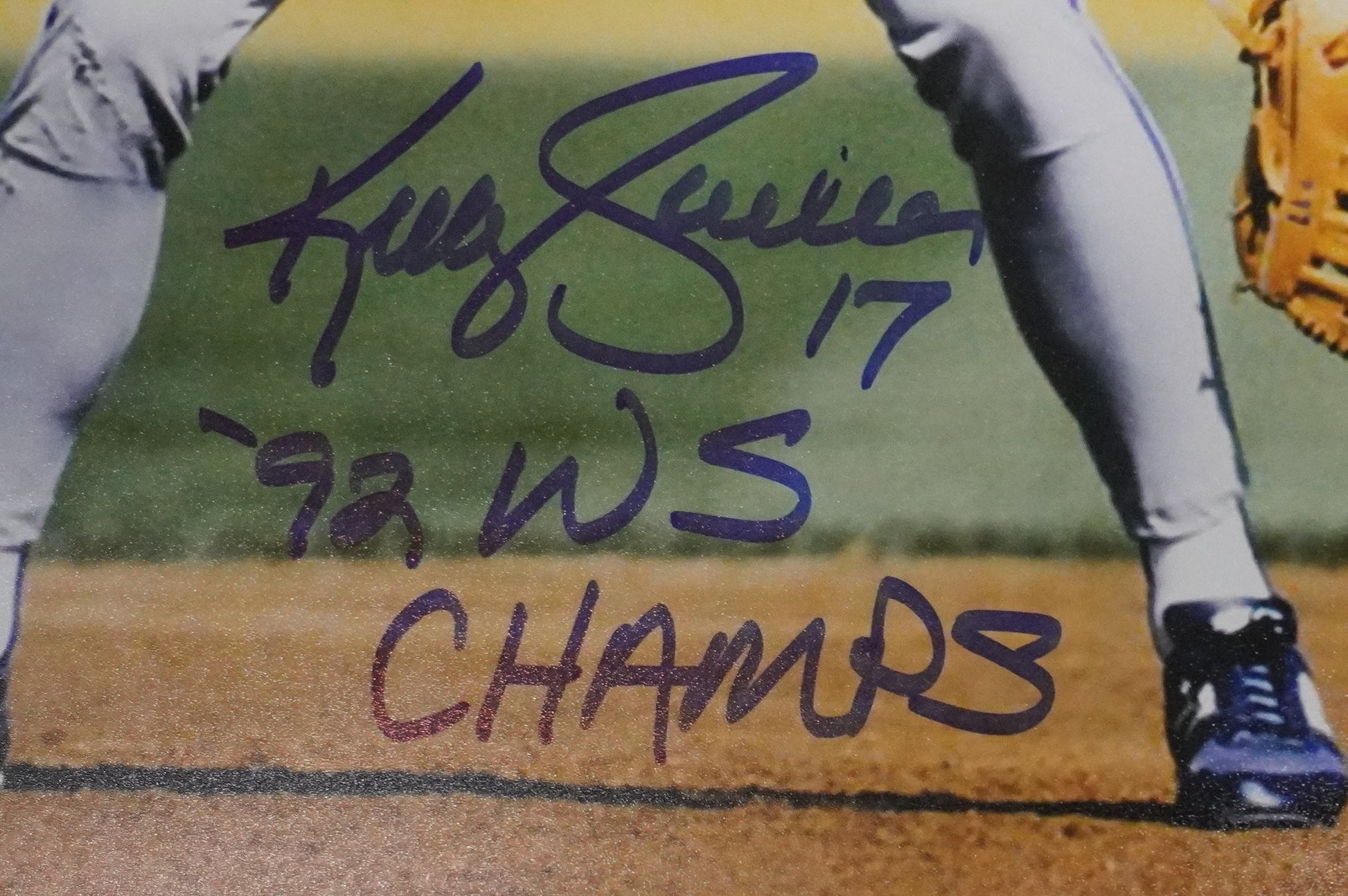 KELLY GRUBER Signed 8x10 Photo TORONTO BLUE JAYS w/"92 W.S Champs" BAS COA