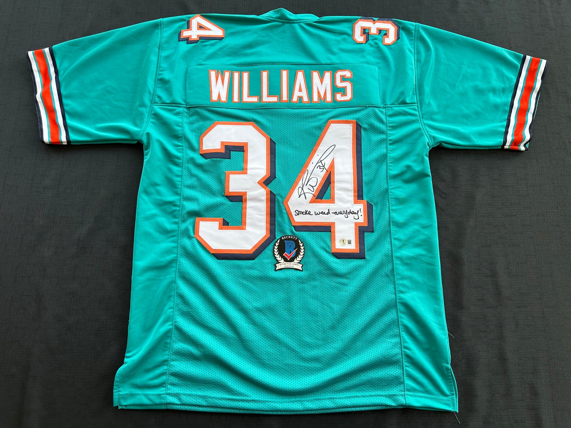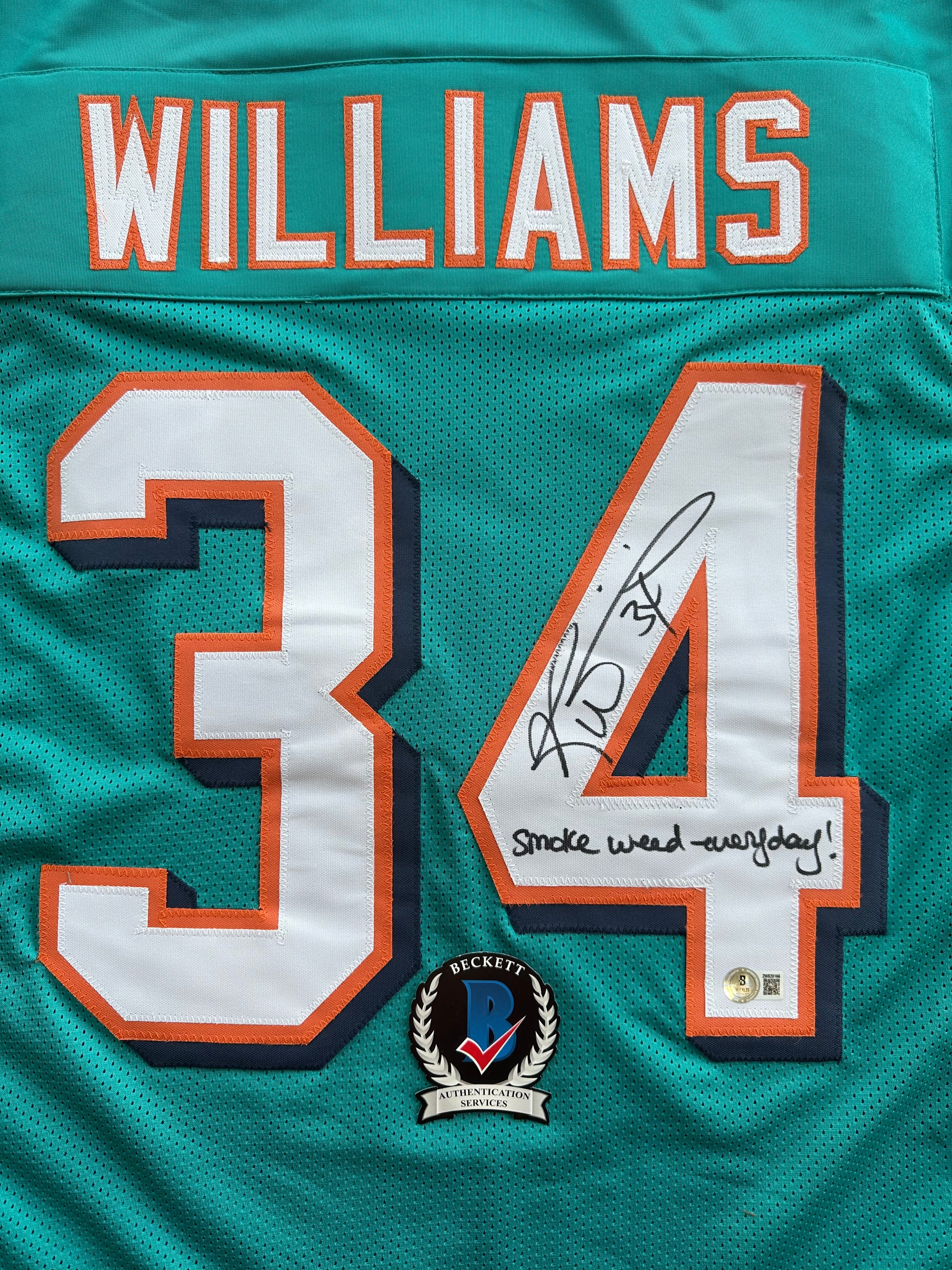 RICKY WILLIAMS SIGNED TEAL FOOTBALL JERSEY Miami Dolphins w/"Smoke Weed Everyday" BAS