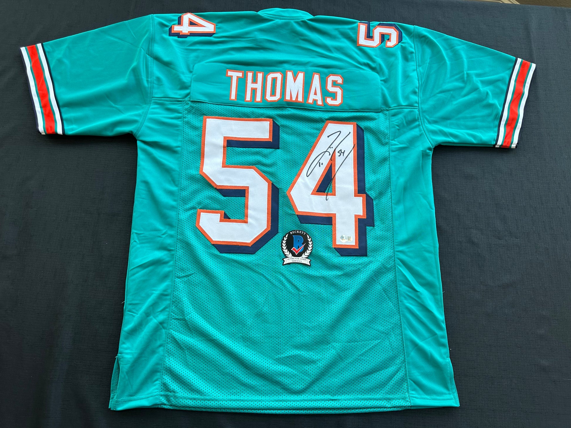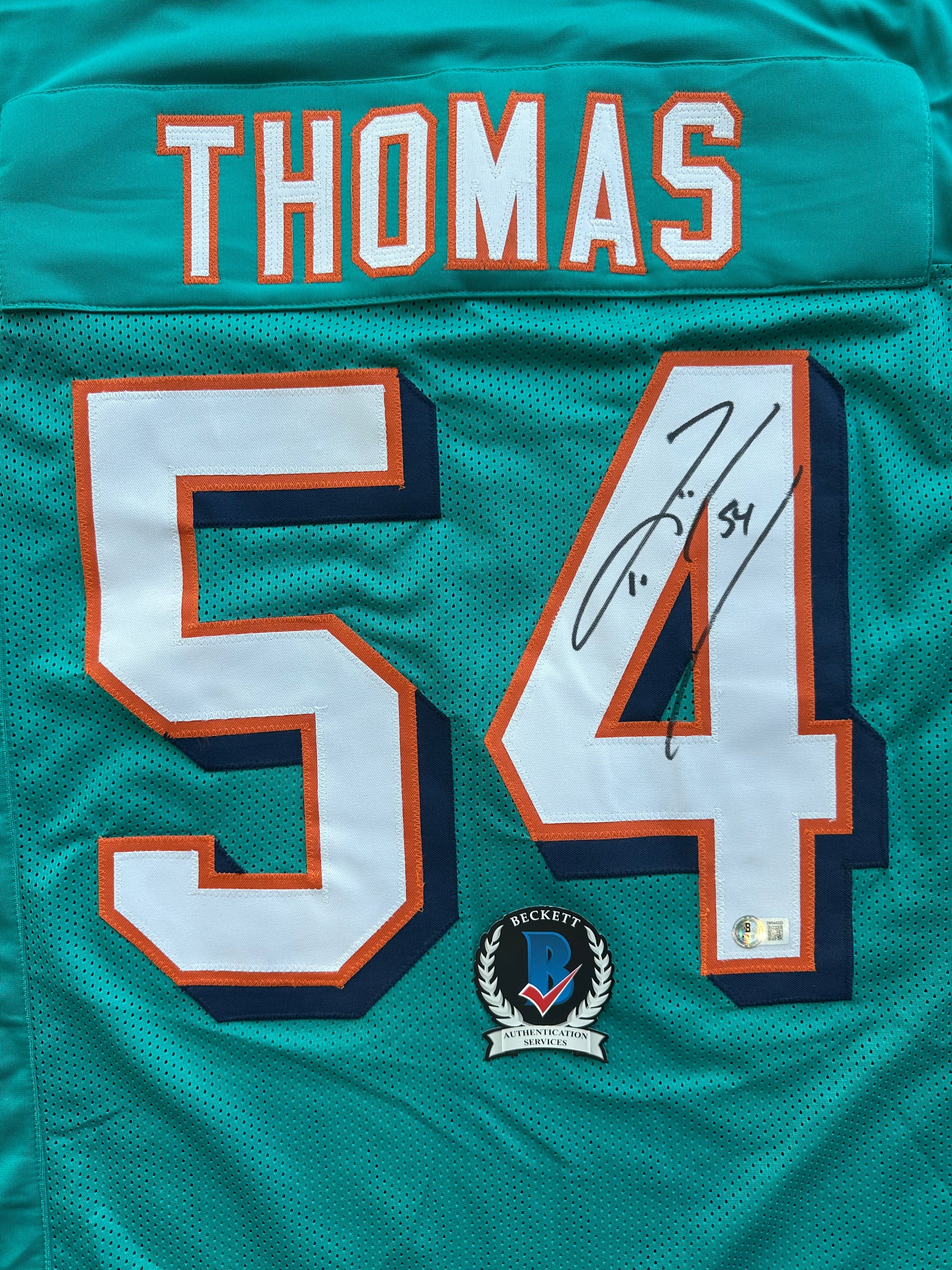 ZACH THOMAS SIGNED TEAL JERSEY MIAMI DOLPHINS BAS